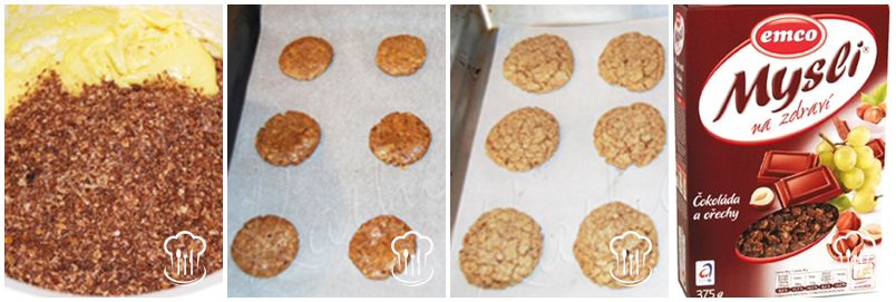 - Vajce vyšľaháme s cukrom a rozpusteným vychladnutým maslom.Pridáme múku zmiešanú so sódou bikarbónou a soľou a rozmixované vločky so škoricovým cukrom. Vznikne tuhšie cesto, z ktorého vytvarujeme guľky s priemerom cca 2 cm. Tieto ešte dlaňou roztlačíme na placku s priemerom cca 4 cm.