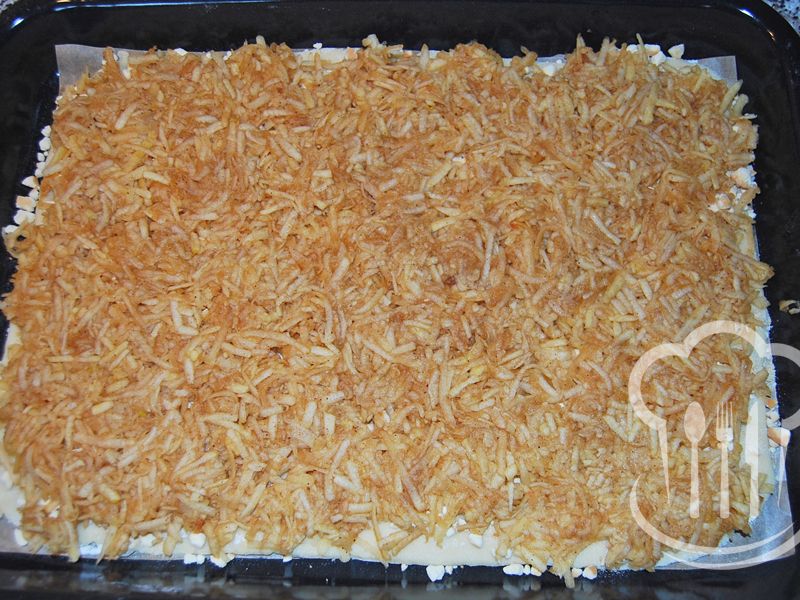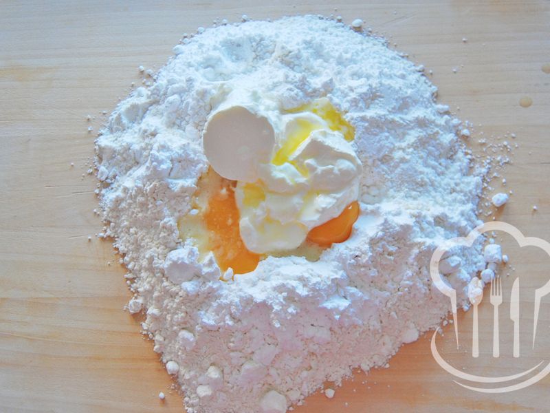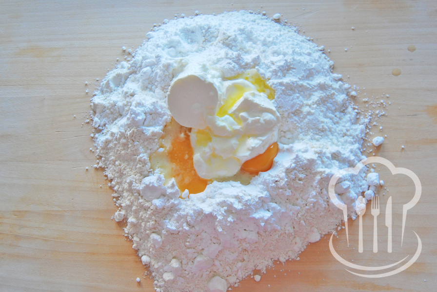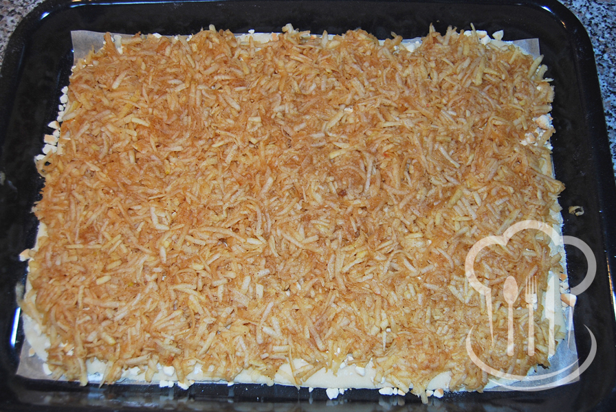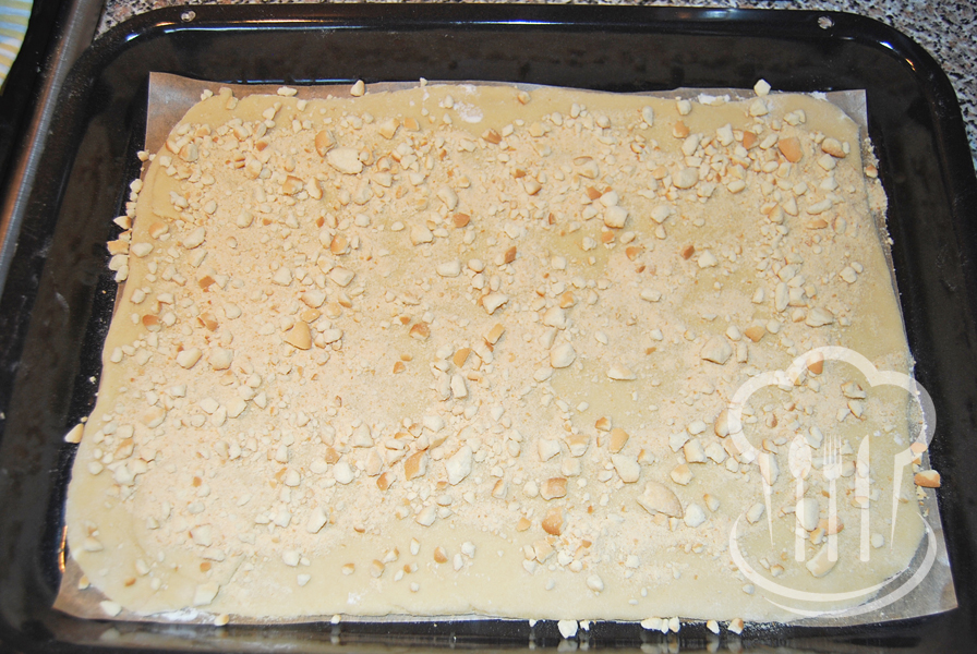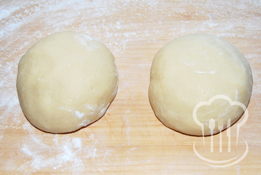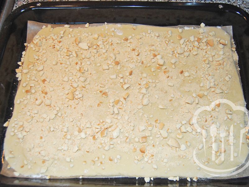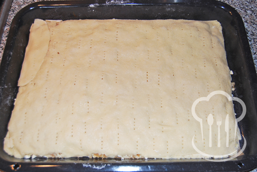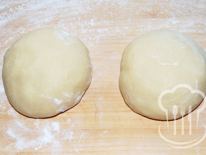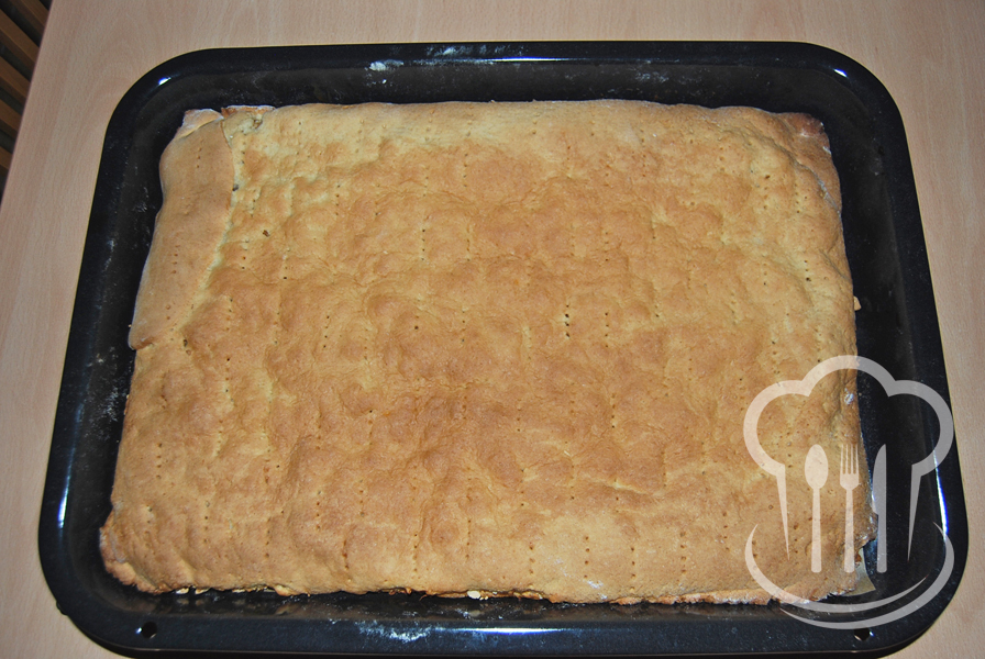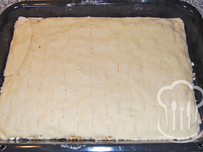 - Z ingrediencií určených na cesto vypracujeme na doske hladkú hmotu, ktorú rozdelíme na dve časti. Každú potom vyvaľkáme na veľkosť plechu 26 x 30 cm.