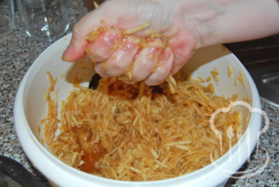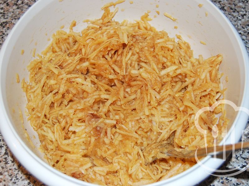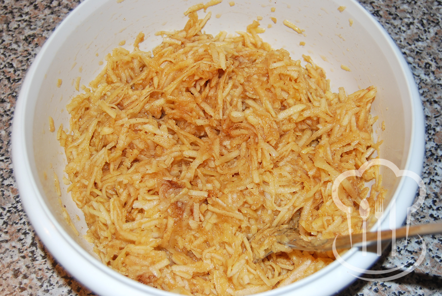 - Jablká nastrúhame a zmiešame so škoricou a cukrom.