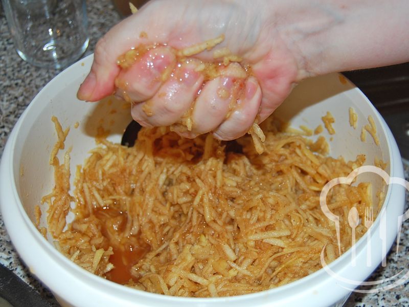 - Cesto posypeme rozdrvenými piškótami a navrstvíme na ne jablkovú plnku. Jablká pritom vyžmýkame v rukách.